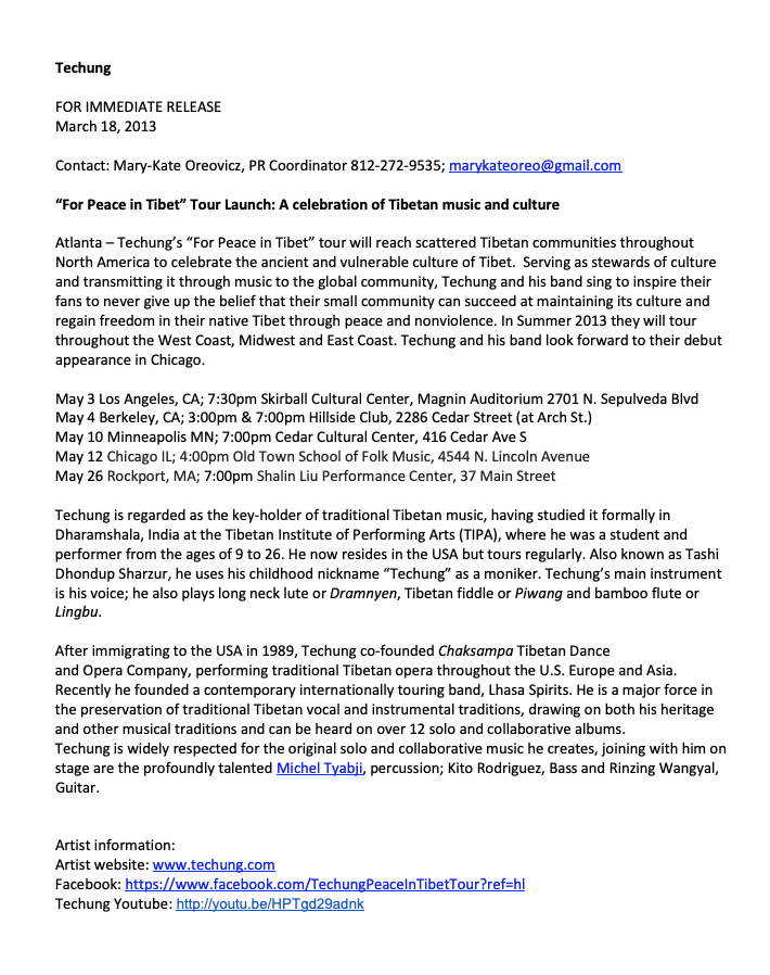 Techung's main instrument is his voice; he also plays long neck lute or Dramnyen, Tibetan fiddle or Piwang and bamboo flute or Lingbu. Techung is widely respected for the original solo and collaborative music he creates, joining with him on stage are the profoundly talented Michel Tyabji, percussion; Kito Rodriguez, Bass and Rinzing Wangyal, Guitar.